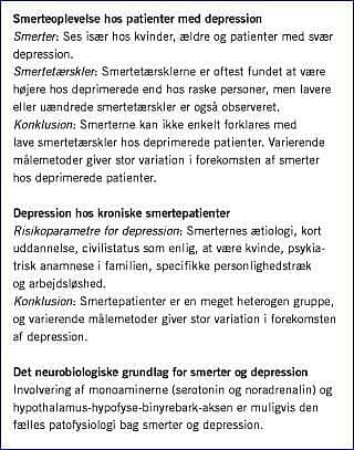 Summary Pain and depression Ugeskr Læger 2006;168(20):1967-1969 Pain and depression are often associated. The frequency of pain complaints in depressed patients is 13-100%. In general, depressed patients have a higher pain threshold than do controls, but lower and unchanged thresholds have also been observed. The frequency of depression in chronic pain patients is 1.5-100%. Pain etiology, short education, marital status, gender, psychiatric family history and unemployment are risk factors for depression. Possible mechanisms underlying the pathophysiology of depression and pain could be involvement of the monoamines (5-HT and NA) and the HPA axis.