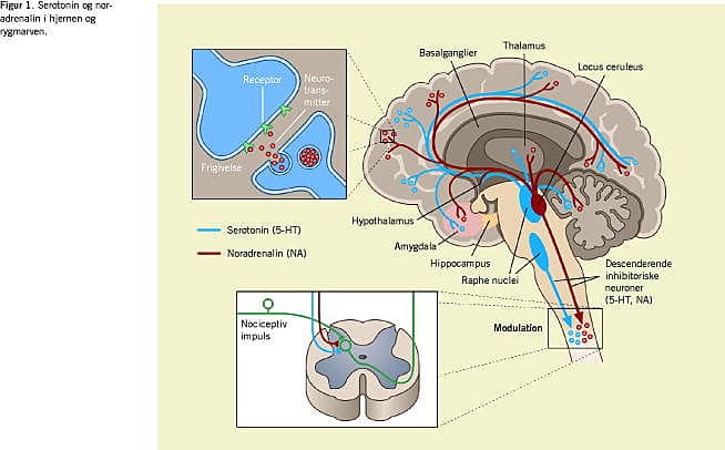 Det er særlig interessant, at samme neurotransmittere og områder i hjernen er involveret i smertesansningen. Neuroner indeholdende 5-HT og NA projicerer fra locus ceruleus i hjernestammen ned i rygmarven, hvor modulationen af nociceptive input foregår (Figur 1). Resultaterne af tidligere danske undersøgelser tyder på, at patienter med neuropatiske smerter har en dysfunktion i deres inhibitoriske kontrol i disse descenderende nervebaner i rygmarven. Dette resulterer dels i deres smertetilstand og dels i en høj sensitivitet for smertefulde stimuli, der er karakteristisk for kroniske smertetilstande [10]. Det er veldokumenteret, at TCA og SNRI kan reducere smertesansningen hos patienter med kroniske smerter med eller uden depression. Antidepressivas smerteregulerende funktion er derfor sandsynligvis forårsaget af en øget aktivi- tet i den inhibitoriske kontrol af de descenderende monoaminerge baner.