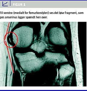 En 28-årig kvinde blev henvist til vurdering af smerter i højre knæ. Smerterne havde været til stede, siden hun slog knæet mod et instrumentbræt ti år tidligere. Ved et primært røntgenbillede kunne man udelukke fraktur i knæet. Siden ulykken havde patienten haft fornemmelsen af, at »noget smutter på indersiden af knæet ved bevægelse«. Der var blevet foretaget tre magnetisk resonans-skanninger, hvor den første viste normale forhold, den anden viste medial plica, og den sidste viste en »mus« medialt i knæet (Figur 1 ). Der blev foretaget flere artroskopier, som intet viste bortset fra kondromalaci bag patella og medial plica. Ved en revurdering kunne man konstatere, at en sene fra pes anserinus sprang over en knogleprominens posteriomedialt for den mediale femurkondyl. Dette skete, når knæet blev bevæget fra ekstension til fleksion. Ved en funktionel ultralydskanning blev det bekræftet, at en sene fra pes anserinus sprang over et isoleret og løst knoglestykke ved den mediale femurkondyl. Dette frie stykke knogle og en lille eksostose blev fjernet i generel anæstesi. Tre måneder postoperativt var smerterne forsvundet, og patienten kunne genoptage sport og arbejde på fuldt niveau.