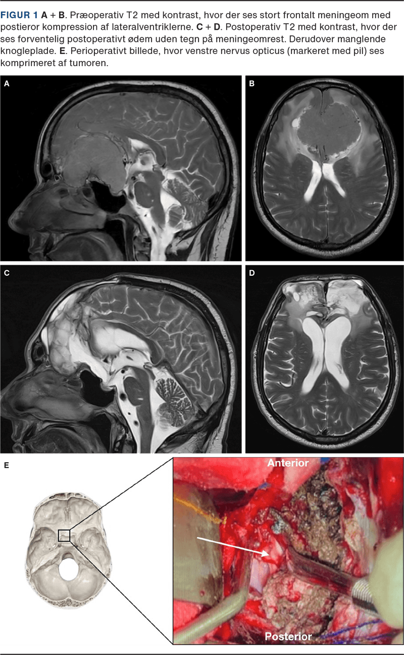 En angiografi viste tumorvaskularisering fra begge arteriae ophthalmicae samt arteria meningea media sinister. Disse blev endovaskulært okkluderet præoperativt. Intraoperativt verificeredes bilateral kompression af nervus opticus (Figur 1 E). Meningeomet blev fuldstændigt reseceret (Simpsons resektionsgrad I), hvorfor recidivraten forventes < 20%. Knoglepladen blev ikke genanlagt på grund af postoperativt ødem, med planlagt genanlæggelse efter fire måneder. En histopatologitest viste benign tumor (WHO grad I). Patienten blev udskrevet til neurorehabilitering med fortsatte neurokognitive deficits og uden forventning om syns- eller lugtgenvinding. Ved tremåneders postoperativ MR vistes forventelige sequelae uden recidiv (Figur 1 C og D).