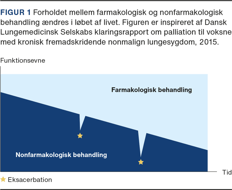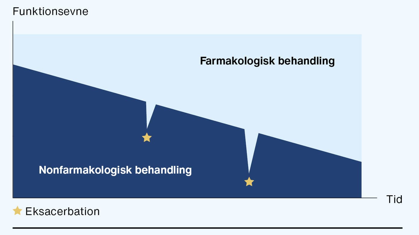Et essentielt supplement til at reducere farmakologisk behandling af KOL er fokus på behandling af KRAM-faktorerne (kost, rygning, alkohol og motion) – særligt rygestop og motion. Disse nonfarmakologiske behandlinger kræver betydelig viden, fokus og målrettet kommunikation fra de sundhedsprofessionelles side, således at man kan skræddersy hjælpen med personaliseret medicin og derigennem øge motivationen hos den enkelte patient. KOL er en dynamisk sygdom, og balancen mellem farmakologisk og nonfarmakologisk behandling ændrer sig, i takt med at sygdommen udvikler sig, men bør altid gå hånd i hånd (Figur 1).