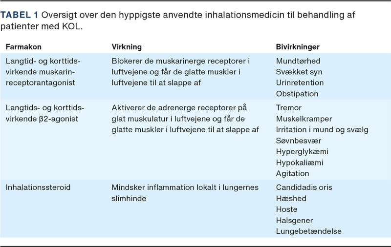 Behandlingen af KOL i almen praksis består overordnet set af tre elementer: rygestop, fysisk aktivitet og medicinsk behandling. Den medicinske forebyggende behandling består primært af en eller to slags langtidsvirkende bronkieudvidende inhalationsmedicin – eventuelt i kombination med inhalationssteroid (ICS) (Tabel 1). For at reducere forbrug af inhalationsmedicin, brugerrelaterede fejl samt for at lette medicinadministrationen kan man med fordel overveje at anvende inhalatorer, som kombinerer forskellige typer af inhalationsmedicin. Prednisolon, antibiotika og korttidsvirkende bronkieudvidende inhalationsmedicin anvendes primært ved akutte forværringer [7]. Andre behandlingsmuligheder eksisterer, men vil ikke blive berørt i denne artikel grundet fokusset på behandlingsmuligheder i almen praksis. Der har de seneste ti år været øget fokus på individualiseret symptomdrevet behandling og på at skabe bedre balance mellem virkninger og bivirkninger i behandlingen af KOL.