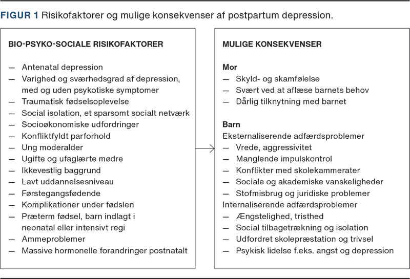 Den postnatale periode indebærer omfattende biologiske, psykiske og sociale forandringer for nye mødre. I de første ti dage efter fødslen oplever minimum 30% af nybagte mødre humørsvingninger, træthed og gråd labilitet, kendt som baby blues (eller postpartum blues eller maternity blues) [1]. Disse symptomer er ofte midlertidige, men hvis de er vedvarende, kan de indikere udvikling af en postpartum depression (PPD). PPD har samme symptomer som andre former for depression, men er ifølge International Classification for Diseases (ICD-10) kendetegnet ved at begynde inden for seks uger post partum. Uden behandling varer PPD i gennemsnit syv mdr. [1-4]. PPD påvirker ikke kun moren, men også hendes barn, deres indbyrdes forhold og familiens samlede trivsel [3]. I Danmark udvikler omkring 5% af mødrene PPD [5], mens en global metaanalyse fra 2018 (291 studier med i alt 296.284 kvinder fra 56 lande) viste en forekomst på 17,7% [6] dog med stor heterogenitet fra land til land, f.eks. 3% i Singapore og 38% i Chile. Praktiserende læger, jordemødre og sundhedsplejersker spiller en central rolle under svangreomsorgen i forebyggelse og tidlig opsporing af PPD [5, 7].