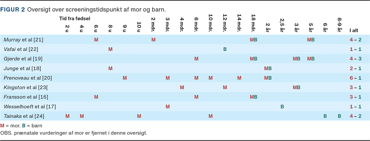 Ved en systematisk gennemgang blev der fundet ni longitudinelle prospektive kohortestudier. Geografisk fordelte studierne sig over flere lande: fire fra Skandinavien [16-19], to fra England [20, 21], to fra Nordamerika [22, 23] og et fra Japan [24]. Publikationsåret gik fra 1999 til 2022 [21, 24], deltagerantallet spændte fra 100 [21] til 11.599 mødre [19], og der blev undersøgt samlet 18.358 mor-barn-dyader for at afdække sammenhængen mellem mors PPD og barnets SE-udvikling. Mødrene blev rekrutteret i slutningen af graviditeten eller umiddelbart efter fødslen med en opfølgningsperiode fra 12 mdr. [22] til ni år [24]. Symptomer på PPD blev primært vurderet ved hjælp af Edinburgh Postpartum Depression Scale [16-18, 20-24] og i fire studier suppleret med psykiatriske interview [16, 20-22]. I alle studierne tog man højde for baby blues ved først at starte screening for PPD mindst to uger efter fødslen. Timing og frekvens af screeningsvurderingerne svingede; i nogle studier udførte man screeningen én gang [17, 22], i andre op til seks gange [20] (Figur 2). Dette spektrum af screeningsmetoder afspejler forskellige tilgange til at fange PPD’s kompleksitet og varierende forløb. Søgestreng samt eksklusions- og inklusionskriterier kan fremsendes ved kontakt til forfatterne.