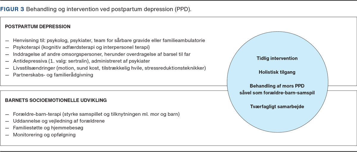 Støtten fra morens netværk er essentiel i den postnatale fase, hvor netværket både kan virke som en potentiel risikofaktor og en værdifuld ressource i behandlingsforløbet. Aktiv inddragelse af andre omsorgspersoner, primært far, men også bedsteforældre er en stor del af behandlingen [5, 14]. Omsorgspersonerne er en uvurderlig emotionel støtte og praktisk assistance, der kan aflaste moren med børnepasning og facilitere, at moren får professionel behandling. Partners engagement er særligt vigtigt for at styrke familiedynamikken og understøtte behandlingen. I Danmark er det en mulighed, at mor kan blive sygemeldt, og partneren kan overtage barselsorloven [30]. Denne flerfacetterede tilgang sikrer, at barnet kan udvikle tilknytningsbånd til flere omsorgspersoner, hvilket giver en ekstra lag af støtte og stimulation. Dette aflaster moren og fremmer en positiv SE-udvikling, mens hun får den nødvendige behandling [8, 14]. En oversigt over behandlingstiltag kan ses i Figur 3.