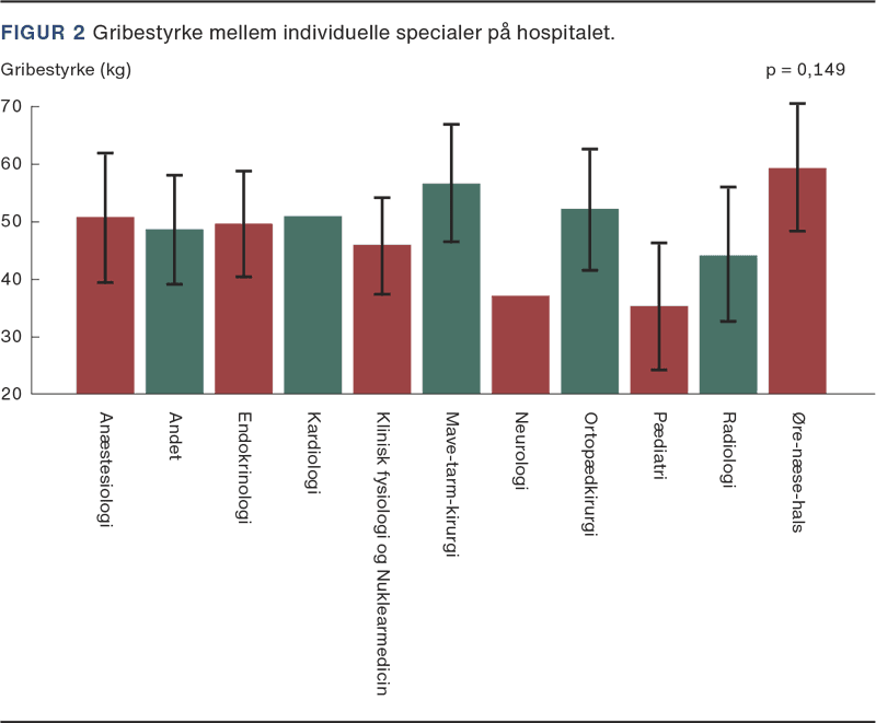 Gribestyrken var signifikant højere hos de kirurgiske specialer med et gennemsnit på 54,7 (14,3) kg, sammenlignet med de medicinske og parakliniske specialer på 46,7 (13,2) kg, p = 0,032 (Figur 1). Individuelle forskelle mellem subspecialer kunne ikke påvises, p = 0,149 (Figur 2). Forskellen mellem de kirurgiske, medicinske og parakliniske specialer udeblev dog, når der blev korrigeret for køn, og om personen vanligt styrketrænede mindst én gang ugentligt (Figur 3). Efter korrigering var kun mandligt køn af signifikant betydning for gribestyrken, p < 0,001.