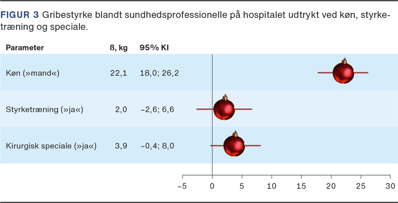 Der blev ikke observeret nogen interaktionseffekt mellem det at være mand og træne mindst én gang ugentligt (β = 4,3 (95% KI: –8,0; 16,5), p = 0,489) eller mellem det at være mand og være i et kirurgisk speciale (β = 8,4 (95% KI: –17,3; 0,5), p = 0,064). Desværre havde de fem personer, der ønskede at være julemand, en signifikant lavere gribestyrke på 14,8 (95% KI: 2,3; 27,4) kg sammenlignet med dem, der ikke ønskede det (p = 0,021).