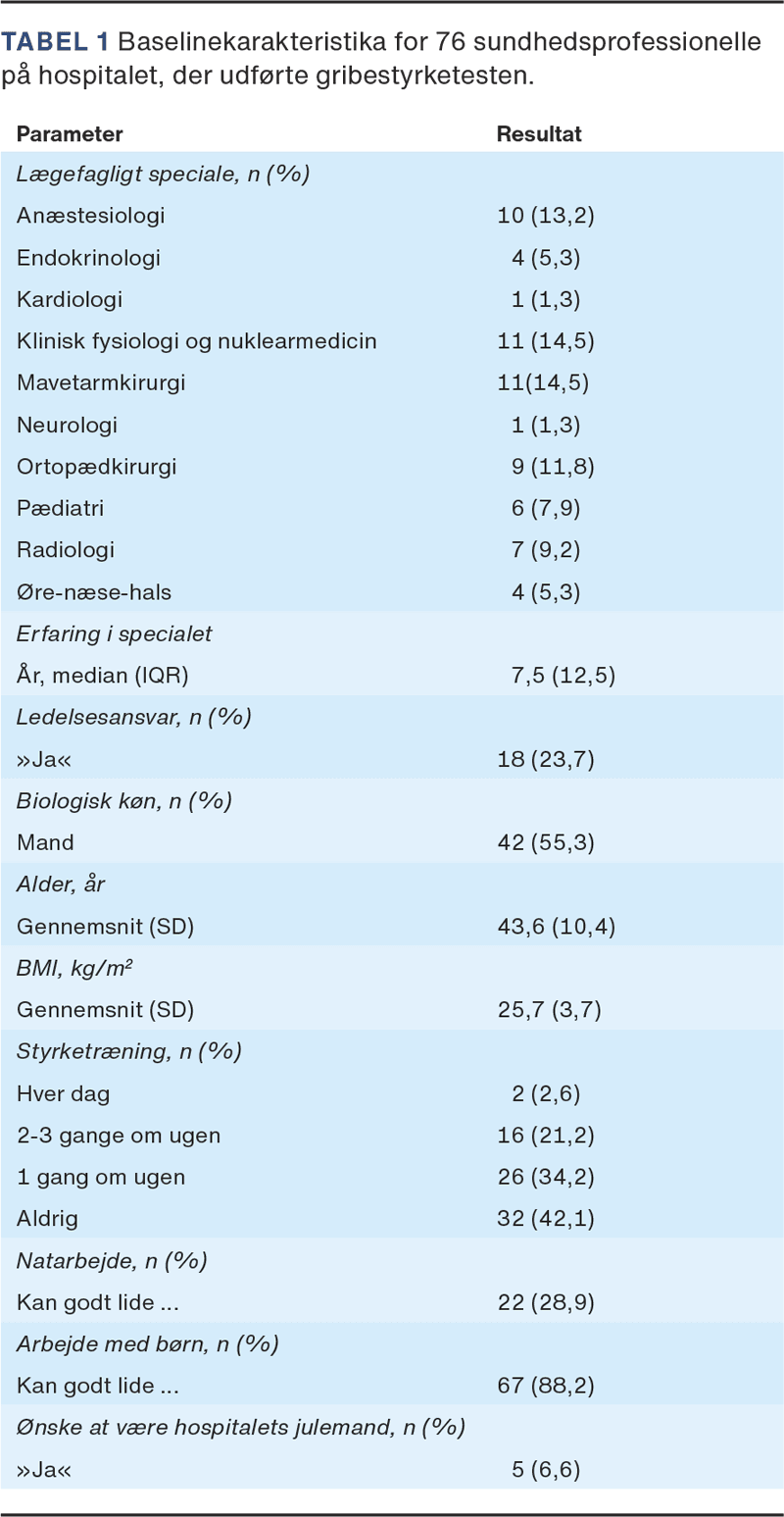 Gribestyrken blev målt med et håndholdt hydraulisk dynamometer af uddannet personale fra klinisk fysiologisk afsnit. Deltagerne udfyldte et spørgeskema via en QR-kode, hvor de bl.a. angav speciale, fritidsaktiviteter og præferencer for at arbejde med børn og natarbejde. Spørgeskemadata blev indsamlet i Google Forms. Rekruttering skete via plakater og intranetopslag, og deltagerne blev lokket med nissehuer og pebernødder – dog ikke honninghjerter, da det var forbundet med dårlige associationer. Efter lav lægedeltagelse blev inklusionen udvidet til alle ansatte. Alle gribestyrkemålinger blev udført på dominant hånd, og resultaterne blev registreret i kilogram.