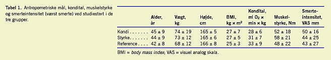Ved studiestart var de tre grupper ikke forskellige mht. antropometriske mål, kondition, muskelstyrke og smerteintensitet (Tabel 1).