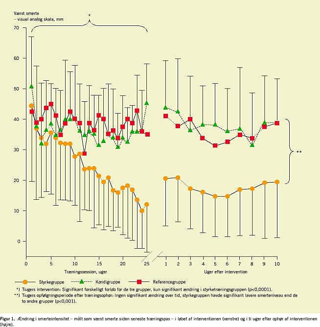 Over interventionsperioden var der en statistisk signifikant forskel mellem de tre grupper i smerteændring (p < 0,0001). I styrketræningsgruppen var der et signifikant fald i smerteintensitet på 79% over ti uger, og efter interventionens ophør og ti uger frem var smerteniveauet i denne gruppe stadig mere end halveret i forhold til de to andre interventionsgrupper (Figur 1).
