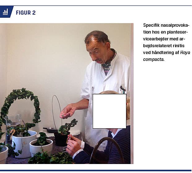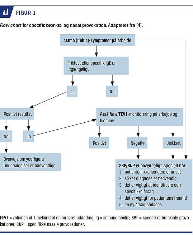 Astma og allergisk rinokonjunktivitis (RC) forekommer hos ca. 20% af danskerne. Over 400 stoffer forårsager arbejdsbetinget astma [1]; af dem er mange identificeret med hjælp af specifikke bronkiale provokationer (SBP). Højmolekylære allergener kan identificeres med specifikke immunglobulin (Ig)E eller hudpriktest (SPT) [2, 3]. Påvisning af specifik (immunologisk) sensibilisering over for lavmolekylære stoffer, som anvendes i lak, maling, lim, isoleringsskum m.m., er mere vanskelig. Specifik IgE eller foretaget SPT findes sjældent. Her kan man overveje en specifik provokation for at af-klare årsagen til lidelsen (Figur 1). Veludført peak flow-monitorering kan hjælpe, men den er ikke specifik [5].