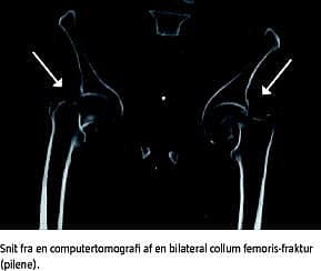 En spontan bilateral collum femoris-fraktur i forbindelse med kronisk nyresygdom, steroidbehandling, fluoridbehandling eller alkoholinduceret fraktur ses sjældent hos yngre patienter, men er beskrevet i danske kasuistikker.
