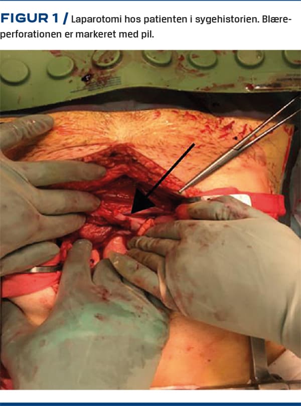 Man foretog en akut eksplorativ laparotomi og fandt en 7 cm stor tværgående ruptur over blæretoppen (Figur 1). Der var store mængder urin i bughulen. Tyndtarmene var ikke indeklemt i perforationen, men lå klos op ad blæretoppen. Tyndtarmene blev gennemgået og var vitale. Herefter blev blæreperforationen oversyet. Postoperativt blev patienten delirøs og rodende, og man havde mistanke om abstinenser, da han havde temperaturforhøjelse og høj puls. Han benægtede dog stadig, at han havde et alkoholoverforbrug. Det efterfølgende postoperative forløb var ukompliceret, og han blev udskrevet på tredje postoperative dag med KAD, som blev seponeret 14 dage senere i ambulatoriet.