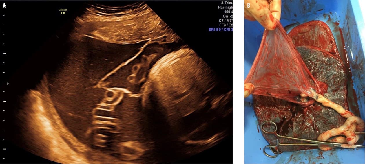 CAS opstår, når amnionhinden helt eller delvist adskilles fra chorionhinden og kun er sammenhængende ved navlesnorens vedhæftning til placenta [1]. Hinderne fusionerer omkring uge 16, og herefter betragtes CAS som patologisk. CAS kan opstå iatrogent eller spontant og er associeret med for tidlig fødsel og for tidlig vandafgang [2]. CAS er også associeret med intrauterin død, da der menes at være en risiko for, at de løse hinder kan danne et bånd rundt om navlesnoren med risiko for kompression [3], hvilket illustreres tydeligt på B.