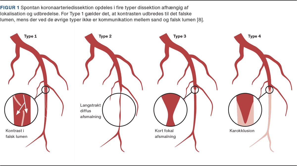 SCAD inddeles i fire typer (Figur 1) afhængigt af dissektionens omfang og kommunikation mellem det sande og falske lumen [10]. Angiografisk mønstergenkendelse er vigtigt for at erkende SCAD. Eventuelt kan der i tvivlstilfælde suppleres med intravaskulær billeddannelse.