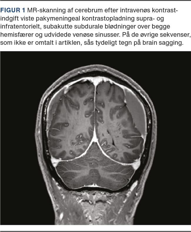 En 52-årig tidligere rask mand debuterede med pludselig indsættende svimmelhed, høretab, tinnitus og trykkende hovedpine på en flyvetur i maj 2019. Da der var mistanke om barotraume søgte patienten otolog, men undersøgelse og rutine-CT af cerebrum og MR-skanning af cerebrum (MR-C) blev beskrevet som normale. På grund af vedvarende symptomer blev der foretaget en ny MR-C, nu med gadolinium i juni 2019, og her påvistes pakymeningeal opladning, men af uvisse grunde blev der ikke foretaget yderligere udredning. Patienten blev senere henvist til neurolog, da generne fortsatte, og en ny MR-C den 2. januar 2020 viste bilaterale subdurale hæmatomer og pakymeningeal opladning (Figur 1). Da der ikke var masseeffekt, afstod man fra neurokirurgisk evakuering af hæmatomerne. Der var ingen andre traumer eller risikofaktorer, og da generne var klart ortostatiske, dvs. intense efter 5-10 min i oprejst stilling og minimale i liggende stilling, fik man nu mistanke om SIH. Lumbal blood patch (BP) den 6. januar 2020 havde god effekt, men der kom gradvist recidiv af hovedpinen og svimmelheden efter få uger. Ny BP den 6. februar 2020 gav hurtig symptomfrihed fraset let tinnitus. MR-C den 19. maj 2020 og den 22. august 2020 viste delvis regression af forandringerne. Ved sidste opfølgning i juli 2021 var generne helt remitteret, og patienten var velbefindende.
