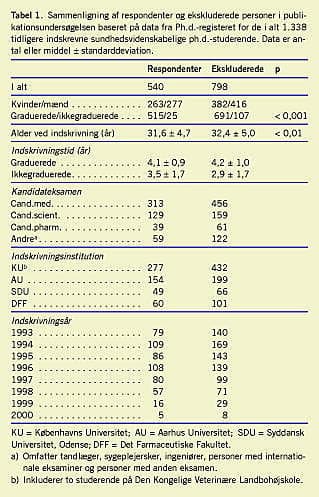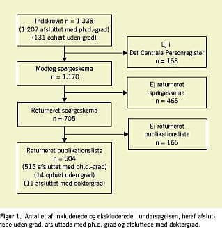 På baggrund af Forskningsstyrelsens Ph.d.-register identificeredes 1.338 personer som indskrevne ved en dansk sundhedsvidenskabelig ph.d.-uddannelse i perioden 1993-2000 (Figur 1 ). Idet 168 ikke var registrerede med adresse i Det Centrale Personregister, blev i alt 1.170 personer pr. brev bedt om at besvare et internetbaseret spørgeskema eller efter 1-2 rykkerbreve at besvare et identisk papirbaseret spørgeskema [3]. I alt 540 (46% af de adspurgte, 40% af den identificerede population) besvarede både spørgeskemaet og indberettede publikationslister, hvorefter de blev inkluderet i undersøgelsen. Af de 1.338 inkluderede personer var 1.207 graduerede, og 131 var ophørt uden grad. Af de 540 respondenter havde 515 afsluttet med en ph.d.-grad og 14 uden grad; 11 oplyste at have erhvervet en disputatsgrad i stedet. Af de 165, der blev ekskluderet på grund af manglende publikationslister, havde 136 med sikkerhed ikke returneret publikationslister, mens 29 måtte udelades, da de ikke med sikkerhed kunne klassificeres som manglende svar eller totalt fravær af publikationer i alle publikationsperioder og alle publikationskategorier (førsteforfatter/medforfatter og relation til afhandlingen).