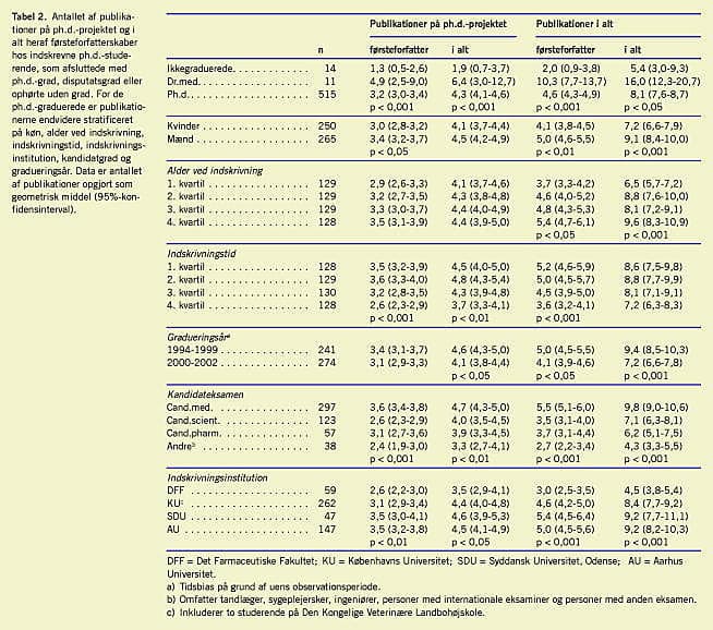 Materiale og metoder: På baggrund af Ph.d.-registeret og Det Centrale Personregister gennemførtes en enqueteundersøgelse blandt 1.170 tidligere indskrevne sundhedsvidenskabelige ph.d.-studerende. Antallet af publikationer med eller uden relation til ph.d.-projektet blev grupperet på køn, alder, kandidatgrad, institution, indskrivningsår og -længde. Svarprocenten var 46 på publikationslister.