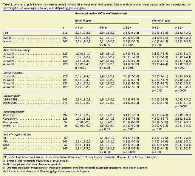 De ph.d.-graduerede publicerede gennemsnitligt (geometrisk middel) fire arbejder baseret på ph.d.-projektet, heraf tre som førsteforfatter (Tabel 2 ). Både under ph.d.-studiet (angivet som 1-3 år for ph.d-grad) og i de første tre år efter publicerede de gennemsnitligt tre artikler (Tabel 3 ), og kun 10-12% af de ph.d.-graduerede publicerede ikke i disse perioder. Året for tildeling af grad (opgjort i 50%-percentiler) var uden betydning for såvel antallet af ph.d.-relaterede førsteforfatterskaber (Tabel 2) som for det totale antal publikationer opgjort i treårsperioder (Tabel 3). Der var ingen forskel på andelen af personer uden pu blikationer i nogen af perioderne. Andelen, der ikke publicerede under ph.d.-studiet, var signifikant (p < 0,01) mindre blandt de medicinske kandidater (9%) end blandt de naturvidenskabelige kandidater (14%), de farmaceutiske kandidater (19%) og andre (26%). Det lavere antal publikationer for de yngste årgange i perioden mere end tre år efter ph.d.-graden forklares af den uundgåelige systematisk fejl, der introduceres ved den kortere observationsperiode.