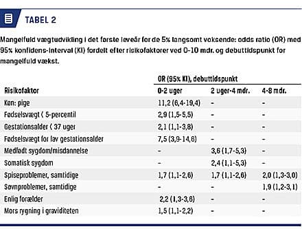 Mangelfuld vægtøgning i spædbarneperioden er en kendt risikomarkør for somatisk sygdom og en potentiel indikator på subnormal neuroudvikling. Resultater fra CCC2000 [15] viser, at alle former for mangelfuld vægtøgning er tæt forbundet med spiseproblemer, mens der i øvrigt ses forskellige risikomønstre, afhængigt af hvornår vægthæmningen manifesterer sig [16] (Tabel 2). Børn, der er født før 37. uge, har lav fødselsvægt for alderen, er piger, født af enlige mødre eller mødre, der har røget i graviditeten, har i højere grad end andre børn vægtproblemer i tiden umiddelbart efter fødslen, mens debut af utilstrækkelig vægtøgning i alderen mellem to uger og fire måneder især er associeret med medfødte misdannelser og alvorlig somatisk sygdom (Tabel 2). Derimod er vægtproblemer som begynder efter firemånedersalderen ikke signifikant associeret til andre faktorer end samtidige spise- og søvnproblemer [16].