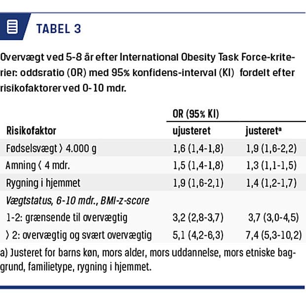 Udvikling af overvægt i alderen mellem seks måneder og otte år er undersøgt i DBS hos 43.109 børn, der var født i perioden 2002-2014. I 6-10-månedersalderen var 3,6% overvægtige, og 0,5% var svært overvægtige, og i 5-8-årsalderen var 9,9% overvægtige og 2,7% svært overvægtige [18]. Der blev fundet stærkt øget risiko for vedvarende overvægt fra spædbarnealderen til 5-8-årsalderen. Således viste analyser justeret for køn, indvandrerstatus, mors alder, mors uddannelse, familiestatus, rygning i hjemmet og varighed af amning en mere end syv gange øget risiko for svær overvægt ved skolestart, hvis barnet var overvægtigt i det første leveår (Tabel 3).