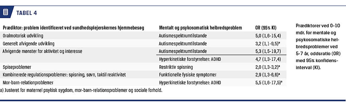 Longitudinelle data viser, at problemer med oralmotorisk funktion, udvikling, tidlig kontakt og kommunikation samt regulering af opmærksomhed og aktivitet er associeret med neuroudviklingsforstyrrelser ved halvandetårsalderen [21] og med autismespektrumtilstande og ADHD ved 5-7-årsalderen (Tabel 4) [22]. Disse fund supplerer resultaterne i international forskning og tyder samlet på, at der kan identificeres valide markører for autisme og ADHD tidligere end hidtil