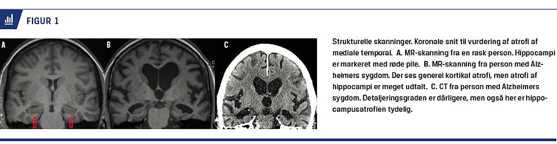 Alle personer, som undersøges for kognitiv dysfunktion, skal udredes med strukturel skanning. Det væsentligste formål med strukturel skanning i forbindelse med basal udredning er: 1) at udelukke andre, behandlelige årsager, f.eks. intrakranial tumor, blødninger (f.eks. subduralt hæmatom) eller hydrocefalus og 2) at afsløre eventuelle vaskulære læsioner (infarkter eller iskæmiske skader) som årsag til den kognitive dysfunktion. Det er også muligt – selv med CT – at påvise specifikke neurodegenerative forandringer (lokaliseret atrofi), der kan lede til diagnosen [2, 3]. Især kan atrofi af de mediale temporallapper understøtte diagnosen Alzheimers sygdom (AS). Denne atrofi kan bedst påvises på koronale snit (Figur 1). CT kan således anvendes som led i basal udredning, men MR-skanning giver ofte supplerende oplysninger. Sensitivitet og specificitet af kliniske diagnosekriterier for AS over for andre demenssygdomme på baggrund af ovenstående basale udredningsprogram er i en metaanalyse fundet at være hhv. 79% og 73%, når referencen er histopatologisk verificering af AS-patologi [4].