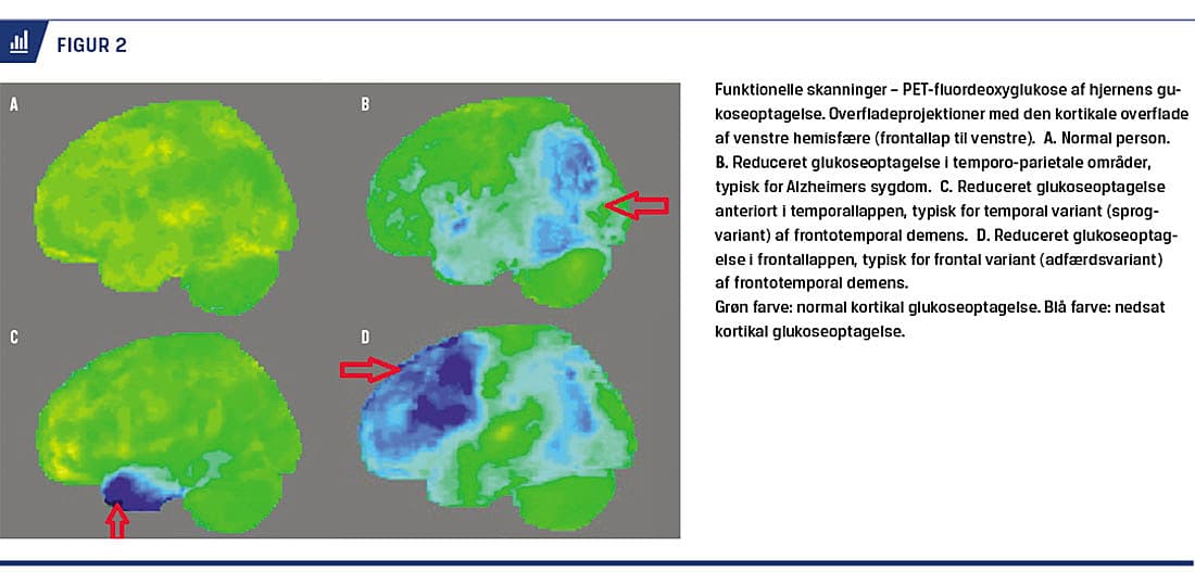 Funktionelle skanninger omfatter funktionel MR-skanning (fMRI), PET og SPECT. Især PET med anvendelse af glukoseanalogen fluordeoxyglukose (FDG) som sporstof (PET-FDG) er hyppigt anvendt til demensudredning, idet reduktion af glukoseoptagelsen kan ses tidligt i karakteristiske områder i cortex ved flere neurodegenerative sygdomme (Figur 2). Da reduktion af glukoseoptagelsen har ganske høj sensitivitet og specificitet for AS i blandede demenspopulationsstudier (hhv. 87% og 77% [4]), kan PET-FDG således anvendes til afklaring af, om der foreligger tegn til neurodegenerativ sygdom hos en person med lette eller tvivlsomme symptomer, eller til differentialdiagnostik mellem forskellige demenssygdomme. Nyere undersøgelser tyder på, at man ved fMRI med måling af kortikal blodgennemstrømning (arterial spin labeling (ASL)) opnår samme diagnostiske sikkerhed som ved PET-FDG [5], men metoden er fortsat behæftet med metodologiske vanskeligheder og har endnu ikke vundet rutinemæssigt indpas i diagnostikken. Fordelen ved MRI-ASL er naturligvis, at man kan foretage samtidig strukturel og funktionel skanning, og at man undgår at udsætte patienten for radioaktiv stråling.