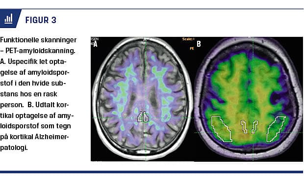 PET med anvendelse af sporstoffer, som bindes til AS-specifik patologi har vundet større udbredelse i de senere år. Fra 2008 har man anvendt PET med betaamyloidsporstoffet Pittsburgh compound B (PiB) i Danmark. Fordelen ved at påvise betaamyloid med PET frem for i CSV er, at PET oftest giver et enten-eller-signal (Figur 3), hvor betaamyloid i CSV kan variere som følge af prøvetagningsprocedurer og assay-variation. Der er dog ganske god overensstemmelse mellem de to metoder med ca. 85% konkordans [8]. PET-PiB synes umiddelbart at være CSV overlegen, når det gælder påvisning af betaamyloid [8], men især omkostninger og logistik begrænser anvendelsen. PET-amyloidskanning øger den diagnostiske sikkerhed og antallet af patienter, som får korrekt behandling, især hos personer med usikker diagnose [9-11]. Metoden kan således anbefales hos diagnostisk uafklarede patienter med kognitiv dysfunktion, hvor påvisning af AS-patologi får en afgørende betydning for information, rådgivning og behandling [12]. Man kan med stor sikkerhed afklare, om patienter har betaamyloid i hjernen ved en simpel visuel bedømmelse af PET-amyloidskanninger (sensitivitet og specificitet hhv. 98% og 89% [13]), men man skal være opmærksom på, at betaamyloidophobning i hjernen forekommer med stigende hyppighed med alderen hos kognitivt raske personer.