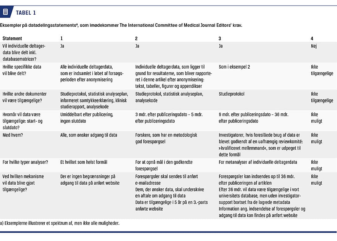 I datadelingsstatements skal der anføres følgende: om ikkepersonhenførbare, individuelle deltagerdata (inklusive datalagre) vil blive delt, hvilke specifikke data der vil blive delt, om yderligere, relaterede dokumenter vil være tilgængelige (f.eks. forsøgsprotokol, plan for statistiske analyser osv.), hvornår og hvor længe data vil være tilgængelige, og ved hvilke adgangskriterier de vil blive delt (inklusive med hvem, for hvilke analysetyper og hvordan). Eksempler på datadelingsstatements, som imødekommer disse krav, kan ses i Tabel 1.