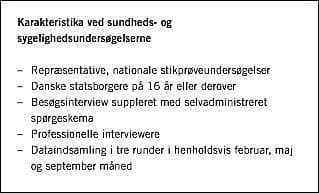 Summary The National Institute of Public Health's program of health and morbidity surveys Ugeskr Læger 2004;166:1438-1441 A series of nationally representative health interview surveys was launched in Denmark in 1986. Interviews with a random sample of the adult population are carried out approximately every five to six years. The interviews include core elements that are repeated in every survey as well as special elements reflecting current public health issues and special research needs. In the future the questionnaires will have to be changed in order to facilitate the collection of comparable survey data in all the EU member states. Increasing rates of non-response and increasing costs of data collection present challenges for methodological development.