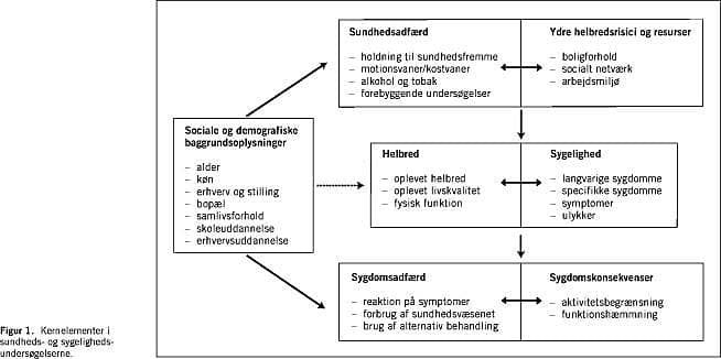 Undersøgelsernes kerneelementer fremgår af Figur 1 . Udgangspunktet for modellen var den traditionelle epidemiologiske model, hvor der skelnes mellem determinanter, sygelighed og helbred/sundhed samt konsekvenser af sygdom og dårligt helbred. Endvidere indgår der en række sociodemografiske forhold som baggrundsvariable for at beskrive de undersøgte forholds variation i forskellige grupper i befolkningen.