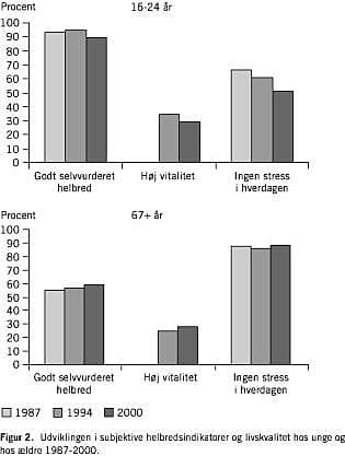 I Figur 2 vises et udvalgt eksempel på resultater fra 2000-undersøgelsen. Andelen af unge (16-24 år), der dels oplever, at deres helbred er godt eller virkelig godt, dels oplever ikke at være stresset i dagligdagen, og dels føler sig energiske og veloplagte respektive ikke føler sig trætte og udslidte (vitalitet), har været for nedadgående i perioden, mens det modsatte mønster gør sig gældende for aldersgruppen 67 år og derover.