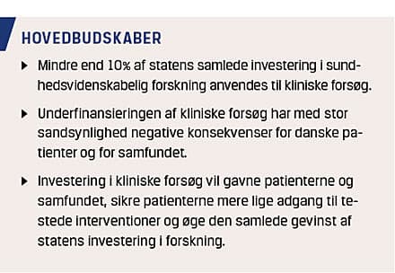 Clinical trials are important to ensure that patients and society benefit from healthcare interventions. Among the Danish public research investments in medical sciences the main part of funding is given to preclinical and translational research, and less than ten per cent is given to clinical trials. This imbalance may have negative consequences for patients and society, because public investment in clinical trials is likely to ensure broader availability of tested interventions independent of diseases, patient groups, caregivers and clinical settings.