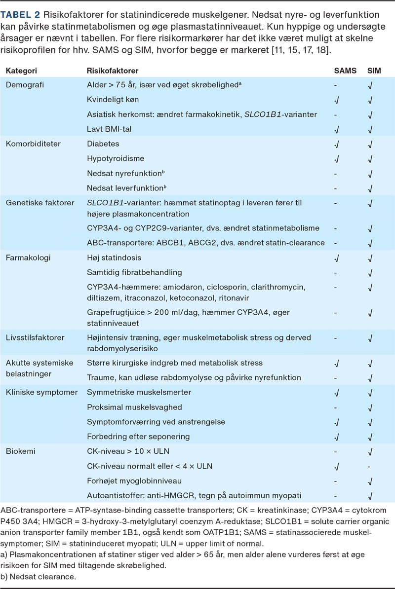 Fokus på muskulære bivirkninger ved statinbehandling skyldes primært risikoen for de mere alvorlige tilfælde af SIM, der ofte forveksles med SAMS (Tabel 1). SIM rammer sjældnere end 1 ud af 20.000 personår [15, 20] og kan i yderste konsekvens medføre nyreskade, nyresvigt og død. SIM er direkte relateret til plasmakoncentrationen af statinet [21], og forhøjet plasmakoncentration skyldes ofte en farmakokinetisk interaktion med et eller flere andre lægemidler [22]. Dette blev første gang observeret hos hjertetransplanterede patienter behandlet med lovastatin og ciclosporin [22]. Ciclosporin hæmmer omsætningen af lovastatin via hæmning af både cytokrom P450 3A4 og P-glykoprotein [15]. En hyppigere årsag til pludselig koncentrationsstigning er samtidig behandling med makrolidantibiotika såsom clarithromycin, der kan øge koncentrationen af simvastatin eller atorvastatin med en faktor 4-10 [18].