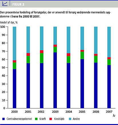 Hvert af årene fra 2000 til 2007 er ca. to tredjedele af det totale antal forsøgsdyr blevet brugt til forskning i menneskets sygdomme (Figur 1). Dette antal, som udgjorde ca. 220.000 forsøgsdyr pr. år, har været forholdsvis konstant igennem i hele perioden. Omtrent halvdelen (48-69%) af disse forsøgsdyr blev brugt til forskning i nerve- og sindslidelser ( Figur 2 ). Her er det tydeligt, at væsentlige dele af den danske medicinalindustri, eksempelvis Lundbeck og Neurosearch, har fokuseret på udvikling af neuro- og psykofarmaka, ligesom der også i offentligt regi er foregået en del hjerneforskning på danske forsøgsdyr. I perioden har 95-100% af forsøgsdyrene inden for forskning i nerve- og sindslidelser været gnavere, og det må formodes, at en væsentlig del af disse er brugt til screening af nye potentielle lægemidler, hvorimod der kun medgik ca. 20.000 dyr til toksikologisk afprøvning. Kræftforskningen tegnede sig i perioden for kun 7-13% af forsøgsdyrene, mens forskning i kardiovaskulære lidelser tegnede sig for endnu mindre, nemlig 2-3% (Figur 2). Den resterende tredjedel af forsøgsdyrene blev anvendt til forsøg med andre af menneskets sygdomme, som ikke var nærmere specificeret i den officielle statistik. Til kræftforskning blev der næsten udelukkende brugt mus (93-99%), mens der til forskning i hjerte-kar-sygdomme blev brugt såvel gnavere (82-96%) som andre forsøgsdyr (4-18%), hovedsagelig grise og kaniner. Teknikkerne, der anvendes til at transplantere humane og murine tumorer over på mus, er veletablerede, og derfor er der blevet brugt relativt mange mus i kræftforskningen. Behovet for at udføre forsøg på hjerter, der i størrelse og fysiologi er sammenlignelige med menneskets, er formentlig en af grundene til, at der bruges så relativt mange grise inden for dette område. Samtidig er kaninen det klassiske forsøgsdyr inden for forskning i aterosklerose, om end grise og transgene musemodeller i de senere år har vundet indpas. Der bruges så godt som kun pattedyr (> 99%) til forskning i menneskets sygdomme, mens fugle, padder og krybdyr kun spiller en ganske beskeden rolle. En undtagelse er årene 2000 og 2007, hvor der blev anvendt en hel del fisk til dette formål (for året 2000 tillige en del fugle). Den nærmest dramatiske stigning, der er sket i brugen af fisk som forsøgsdyr inden for de seneste par år, er således ikke slået igennem inden for forskning i menneskets sygdomme, om end der muligvis spores en tendens i 2007.