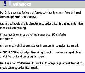 Summary Status: use of laboratory animals since 2000 in Denmark Ugeskr Læger 2009;171(43):3088-3091 Since 2000 the annual use of laboratory animals in Denmark has remained constant at approx. 350,000 animals. Two thirds, i.e. approx. 220,000 of these, were used for medical research. The majority (48-69%) were used for research in neurological and psychiatric diseases, while 7-13% were used for cancer research, and 2-3% for cardiovascular research. The use of rabbits has declined since 2000, while the use of pigs is increasing.