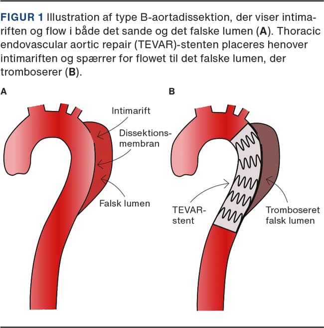 Aortadissektioner opstår som følge af en akut opstået rift i tunica intima, hvorigennem blodet kan trænge ind i aortavæggen og dissekere sig frem gennem tunica media. Herved dannes der et nyt lumen, det falske lumen, der er adskilt fra det sande lumen af en dissektionsmembran (Figur 1). Der skelnes mellem ukomplicerede type B-dissektioner, hvor dissektionen ikke har medført komplikationer såsom organ- og ekstremitetsiskæmi, behandlingsrefraktære smerter eller aortaruptur, og komplicerede B-dissektioner, hvor en eller flere af ovenstående komplikationer er til stede [3-5]. De første 14 dage efter symptomdebut betegnes type B-dissektioner som akutte og herefter som kroniske [3-5]. Standardbehandlingen af ukomplicerede type B-dissektioner har traditionelt set været medicinsk bestående af antihypertensiva og analgetika. Formålet med behandlingen er at reducere trykbelastning af aortavæggen og mindske trykket i det falske lumen [3-5]. Med optimal medicinsk behandling er tredivedagesmortaliteten for patienter med ukompliceret B-dissektion omkring 2,4% [6, 7]. Kirurgisk behandling af B-dissektioner er forbundet med en mortalitetsrate på over 50% i den akutte fase [8] og betragtes derfor som værende for risikabel og ikke velegnet til behandling af ukomplicerede B-dissektioner.