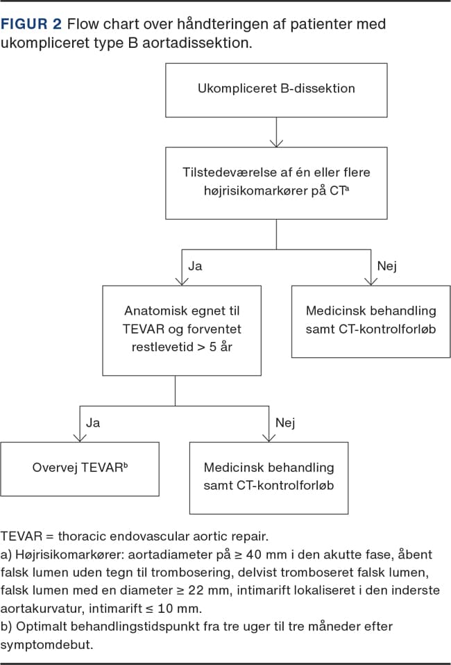 Der er således fortsat mange spørgsmål, der kræver yderligere belysning, førend den optimale behandlingsstrategi til patienter med ukomplicerede B-dissektioner kan fastlægges. Til dette formål er der iværksat større randomiserede kliniske forsøg, men indtil resultaterne fra disse studier foreligger anbefales det at følge behandlingsalgoritmen som beskrevet i Figur 2.