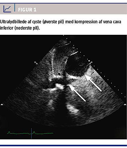 På mistanke om samtidig lungeemboli blev der udført ekkokardiografi, der ikke viste tegn til højresidig belastning. Man observerede en stor levercyste, der afklemte VCI få cm fra indmundingen til højre atrium (Figur 1).