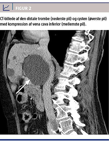 10 × 7 cm, der komprimerede VCI med dillatation under cysten (Figur 2), samt at trombedannelsen strakte sig helt op i den distale VCI.