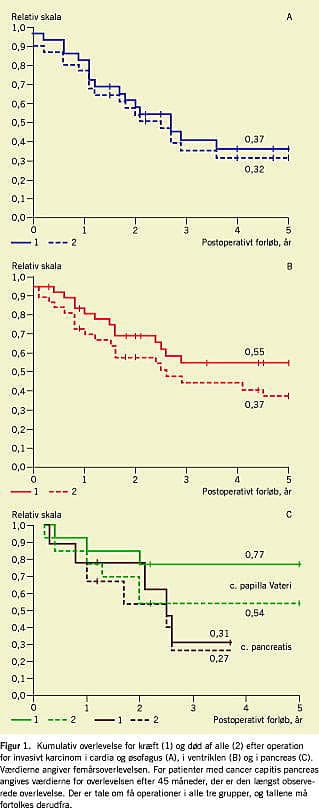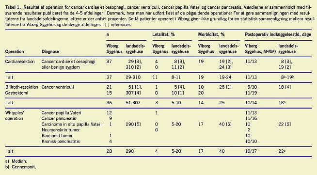 Resultater: Morbiditeten ved cardia- og øsofagusresektion var 19%. Fire døde under indlæggelsen (11%), heraf tre af kardiopulmonale årsager. Indlæggelsestiden var 11 dage (median). Femårsoverlevelsen var for patienter med karcinom 32% for alle dødsårsager og 37% for død af kræft. Morbiditeten ved ventrikelresektion og gastrektomi var 14%, mortalitet var 3%, indlæggelsestiden var ni dage (median) for Billroth II-resektion og 11 dage for gastrektomi. Femårsoverlevelsen totalt var 27% og for død af cancer 55%. Morbiditeten ved Whipples operation var 17%. Mortaliteten var 4% og indlæggelsestiden var ti dage (median). For cancer papilla Vateri var overlevelsen totalt 54% og kræftfri overlevelse var 77%. For cancer pancreatis var treårsværdierne hhv. 37% og 31%.