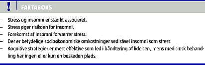 Insomni (søvnbesvær) og stress har betydelige socio- og sundhedsøkonomiske konsekvenser og medfører øget lægemiddelforbrug. Der er en stærk association mellem insomni og stress samt voksende evidens for, at insomni kan opstå i forbindelse med stress og efter traumatiske begivenheder. Insomni kan være medvirkende til udvikling af posttraumatisk stress (PTSD) og kan forværre prognosen [1]. I nærværende artikel søges givet et overblik over de mekanismer, der er forbundet med disse tilstande, de formodede årsager og muligheder for intervention.
