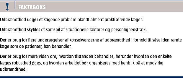 Burnout is characterized by emotional exhaustion, depersonalization and reduced personal accomplishment. In agreement with international studies, Danish figures have revealed an increase in prevalence of severe burnout from 2,8% in 2004 to 5,3% in 2012. There is only little research on the consequences for the burned-out general practitioner (GP) and his patients as well as on appropriate intervention strategies. Even though burnout appears to be caused by a combination of personality factors and environmental conditions, the literature has one-sidedly focused on the resilience of the individual GP.