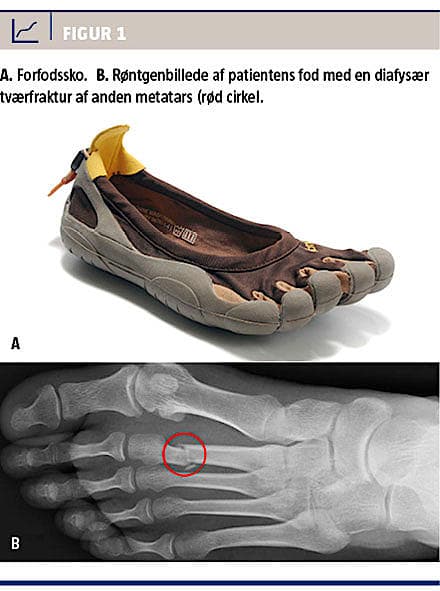 Skader blandt løbere er et velkendt fænomen. Opgørelser viser, at 19-79% af løbere vil få en skade inden for et år [1, 2]. Designere af løbesko hævder ofte, at de minimerer risikoen for skader, men den videnskabelige dokumentation udebliver. Over de seneste par år er en ny løbestil blevet tiltagende populær. Barfodsløb ændrer løbestilen fra at lande med hælen først – som den traditionelle løber – til at lande først med forfoden eller mellemfoden. Fortalere for denne løbestil hævder, at risikoen for skader bliver væsentligt reduceret, idet man får en mere »naturlig« afvikling af løbet [2, 3]. I denne kasuistik beskrives en patient med stressfraktur i anden metatars efter skift til forfodsløb.