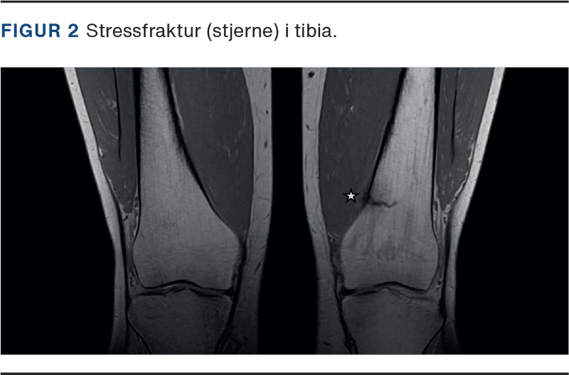 MR-skanning er guldstandard til diagnosticering af SF med sensitivitet og specificitet beskrevet på hhv. 88% og 100% [16]. Derudover kan MR-skanning detektere knoglemarvsødem uger før, at der kan ses radiologiske forandringer [17] (Figur 2).