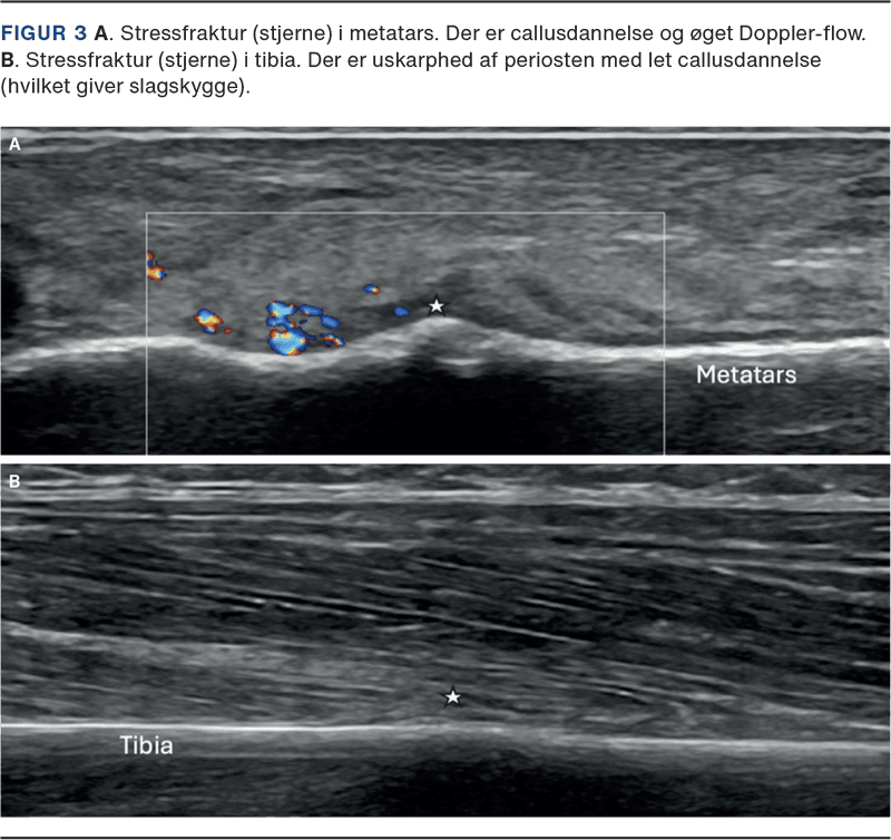 Point-of-care (klinisk) UL-skanning anvendes i stigende omfang til diagnostik af SF. Metoden er lettilgængelig, billig, effektiv og uden stråling, men er meget operatørafhængig. UL-skanning er specielt velegnet til de lange rørknogler (f.eks. tibia og metatarser), hvor sensitiviteten er højere end ved røntgenundersøgelse [15, 18]. Ved UL-skanning kan der ses selv minimale konturspring, periostale blødninger, callusdannelse og øget Doppler-flow (se Figur 3), og forandringerne kan relateres med stor sikkerhed til de kliniske symptomer [21].