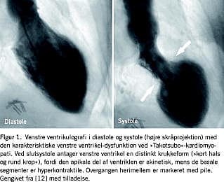 Det er i folkemunde velkendt, at man kan »dø af et bristet hjerte« og »dø af skræk«. Siden 1990 er sandheden i disse udsagn blevet underbygget af en række rapporter, fortrinsvis fra Japan, om et kardiovaskulært syndrom med akut indsættende, reversibel venstre ventrikel-dysfunktion med akinetisk ballonering af apex udløst af psykisk eller fysisk stress hos individer uden signifikant koronarsygdom [1-3]. Patienterne var specielt ældre kvinder og syndromet blev kaldt »Takotsubo«-kardiomyopati (TK, eller stressinduced cardiomyopathy, transient left ventricular apical ballooning, apical balloning syndrome, ampulla cardiomyopathy, broken heart syndrome mv.), efter navnet på en krukke med kort smal hals og kugleformet bund, der blev anvendt til blækspruttefiskeri i det japanske hav og som i profil ligner det venstresidige ventrikulogram i lidelsens akutte fase, med ballonering af apex og kompensatorisk hyperkontraktilitet i de basale ventrikelsegmenter (Figur 1 ). I starten antog man i vesten, at TK var en geografisk/etnisk afgrænset sygdomsenhed, evt. spasmeudløst akut myokardieinfarkt (AMI). Imidlertid er der i de seneste par år fremkommet en række rapporter om TK fra USA og flere europæiske lande (bl.a. Norge), der viser, at TK er en alment forekommende sygdomsenhed [4-15]. Ikke mindst som differentialdiagnose til AMI har kendskab til TK klinisk betydning, og det er derfor fundet relevant at give en oversigt over litteraturen inden for området.