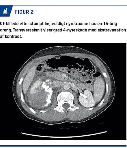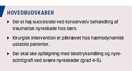 Stumpe abdominaltraumer hos børn er forbundet med betydelig morbiditet og mortalitet [1]. Der ses nyrelæsioner ved 10% af de stumpe abdominaltraumer hos børn [2], som er mere udsatte for nyretraumer end voksne, da deres nyrer er lavere placeret i abdomen, mindre beskyttet af ribben og bugvæggens muskulatur, mere mobile, relativt større og har mindre perirenalt fedt end voksnes nyrer [3].