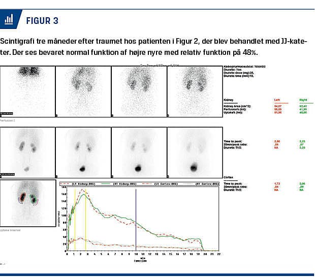 Nyrescintigrafi anvendes til vurdering af nyreparenkymets funktion efter et nyretraume (Figur 3). Fiard et al fandt hos 22 patienter, der var blevet konservativt behandlet for nyretraume grad 4 og grad 5, en middelrelativ nyrefunktion på henholdsvis 39% og 11% [28]. Sammenhængen mellem graden af nyreskade og nedsættelse af den relative nyrefunktion var signifikant. Ved grad 4- og 5-nyretraumer har billeddiagnostisk kontrol tre måneder efter traumet været anbefalet for at kontrollere heling, uden at der dog foreligger konsensus herom [29].